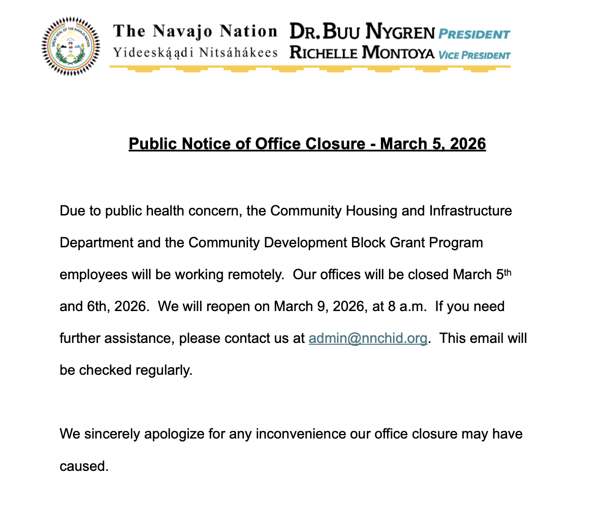 Due to public health concern, the Community Housing and Infrastructure Department and the Community Development Block Grant Program employees will be working remotely. Our offices will be closed March 5th and 6th, 2026. We will reopen on March 9, 2026, at 8 a.m. If you need further assistance, please contact us at admin@nnchid.org. This email will be checked regularly.