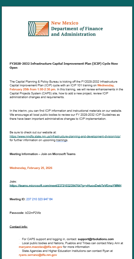 Be sure to check out our website at: https://www.nmdfa.state.nm.us/infrastructure-planning-and-development-division/icip/ for further information on upcoming trainings.